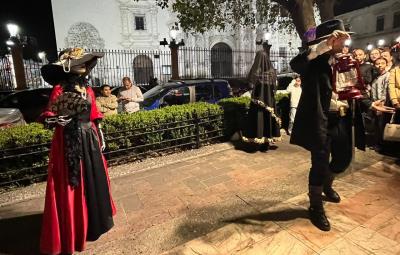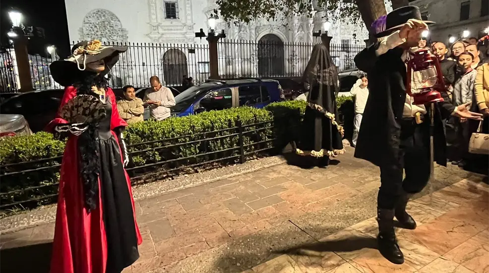 SALTILLO, Coahuila.- La noche oscura y fría envolvió el centro histórico en un manto de misterio durante el evento Supersticiones, un recorrido peatonal de leyendas organizado por Catrije Tours y que invita a los más valientes a conocer las historias más sombrías de la ciudad.