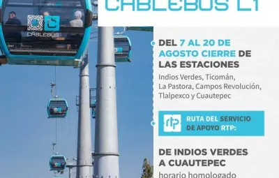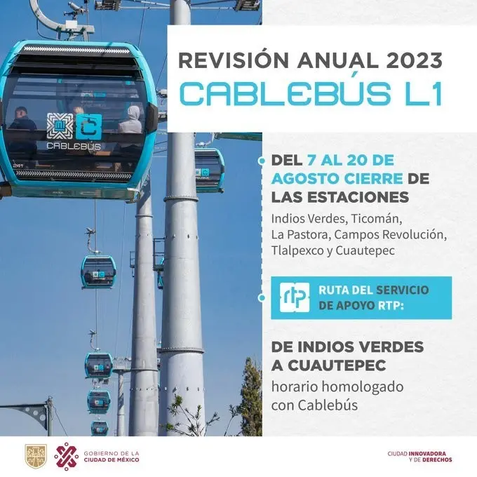 CIUDAD DE MÉXICO.- Debido a la revisión Anual 2023 a la que será sometido el Cablebús, las autoridades de la Ciudad de México, exhortan a la ciudadanía a tomar sus precauciones, pues del 7 al 20 de agosto, el servicio será suspendido en las estaciones:
