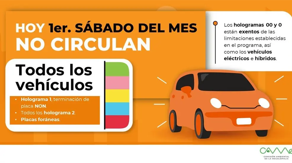 Este sábado 7 de septiembre, se establece la restricción para la circulación de vehículos con holograma 1, terminación de placas NON, Holograma 2 y placas foráneas. Estas medidas forman parte del programa 'Hoy No Circula', cuyo objetivo es reducir la emisión de gases contaminantes en la Zona Metropolitana del Valle de México.