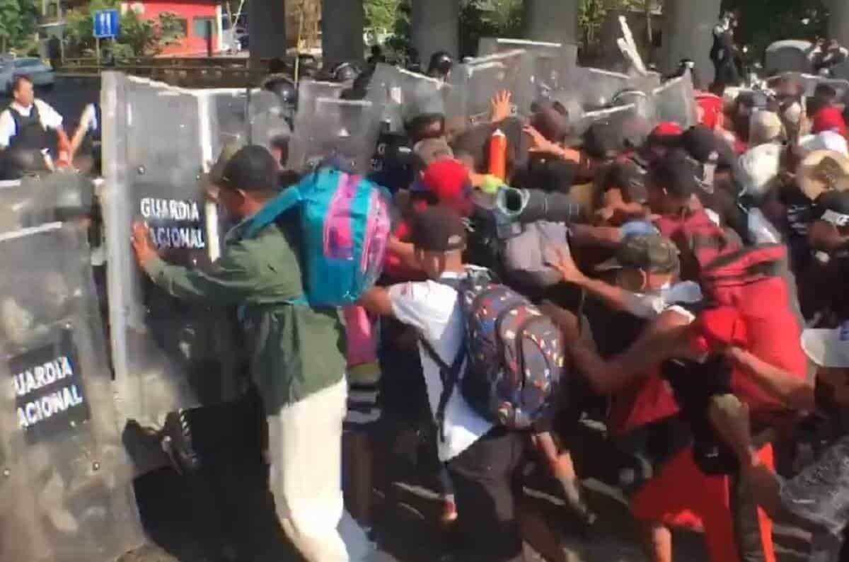 Los hechos ocurrieron en la localidad de Viva México, a la salida del municipio de Tapachula, cuando los migrantes rompieron el cerco de seguridad de la Guardia Nacional, lanzaron golpes y jaloneos; sin embargo, las autoridades mexicanas trataron de contenerlos.