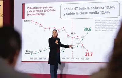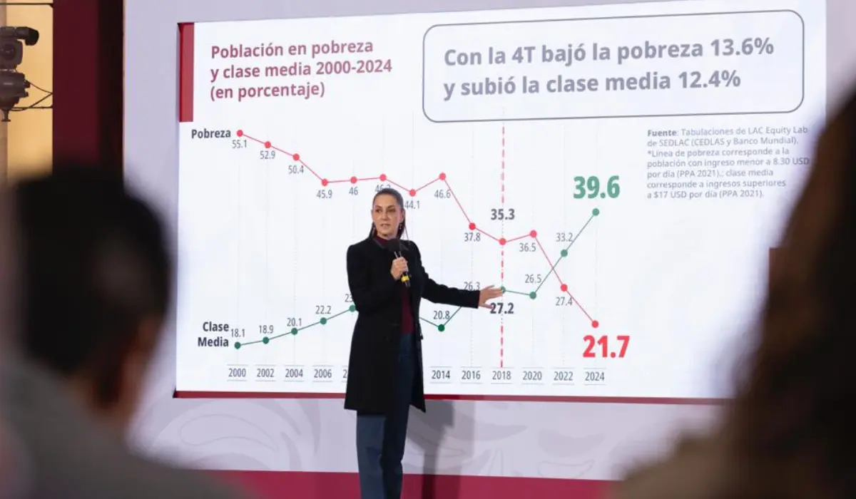 En 2024, los datos indican que la población en pobreza descendió a 21.7%, mientras que la clase media aumentó a 39.6%, lo que marca un cambio respecto a los registros del inicio del siglo. “Comparen esto (2024) con esto (2000). Esta es la brecha y ahora no”, señaló la presidenta.