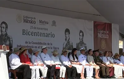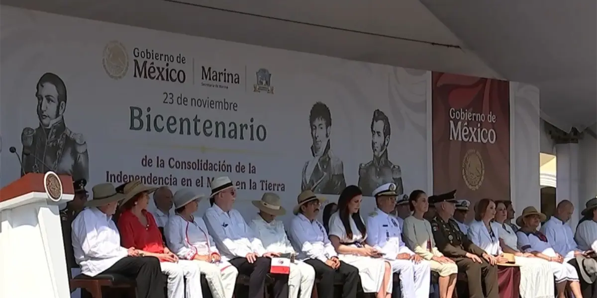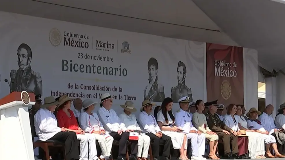 En el marco del 200 aniversario de la Independencia del Mar, la presidenta de México, Claudia Sheinbaum Pardo, el Almirante Raymundo Pedro Morales Ángeles y el secretario de la Defensa Nacional, Ricardo Trevilla Trejo, junto con otros funcionarios, participaron en la ceremonia realizada en el estado de Veracruz.