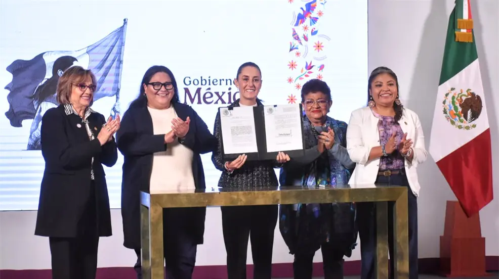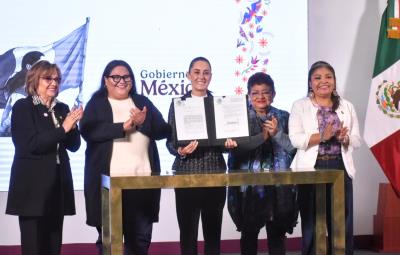 Tras esto, la presidenta, acompañada de Citlalli Hernández, Martha Lucía Mícher Camarena, Ernestina Godoy y Anais Miriam Burgos Hernández, firmó el decreto presidencial ante la presencia de los medios.