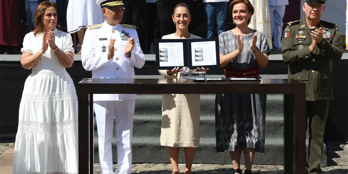 La mandataria encabezó la cancelación del timbre postal conmemorativo, develó la placa por el Bicentenario y entregó condecoraciones y menciones honoríficas a cadetes y personal de la Secretaría de Marina.