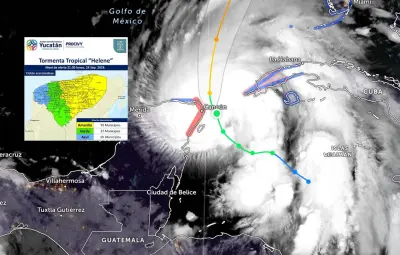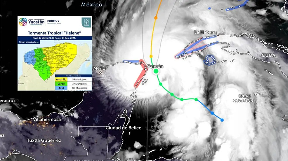 En su reporte de las 3 de la mañana Protección Vivil de Yucatán menciona que la tormenta tropical “Helene” se encontraba a 177 km al sureste de El Cuyo y se traslada al noroeste a 15 km/h con vientos de 100 km/h y rachas de 120 km/h.