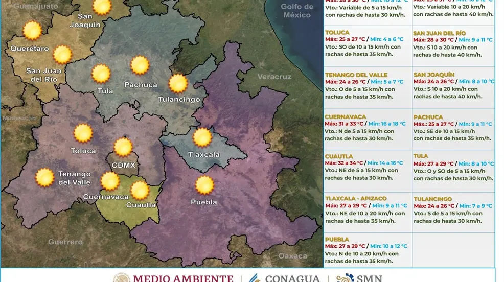 Se prevé viento de componente norte de 10 a 20 km/h con rachas de 30 a 40 km/h en la CDMX y viento de dirección variable de 5 a 20 km/h con rachas de 40 a 60 km/h y posibles tolvaneras en el Edomex.