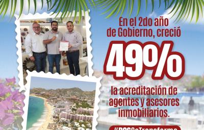 La importancia de continuar promoviendo la acreditación de agentes y asesores inmobiliarios es cumplir con lo establecido en la Ley de Agentes Profesionales Inmobiliarios, que tiene como principal objetivo garantizar la legalidad de las operaciones patrimoniales que se realicen en Baja California Sur, obteniendo un importante aumento en esta tarea del 49%, con relación al primer año de Gobierno