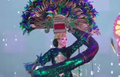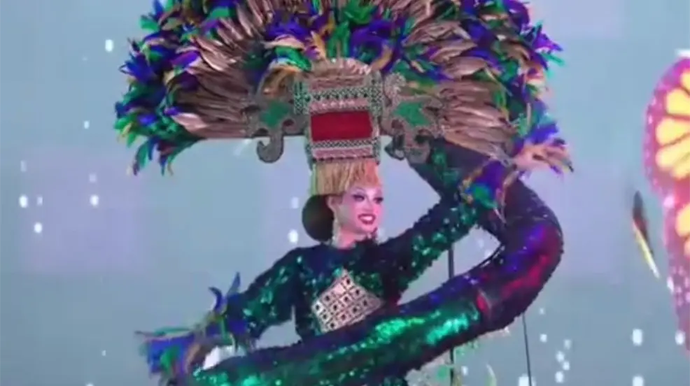 La ganadora tuvo una presentación resaltando las raíces mayas, pues muy al estilo Drag, salió con un primer traje haciendo alusión a Kukulcán una serpiente emplumada y después con el traje típico de Yucatán. Además, que de fondo, tenía una pirámide también maya, que es de donde él hacía sus apariciones.
