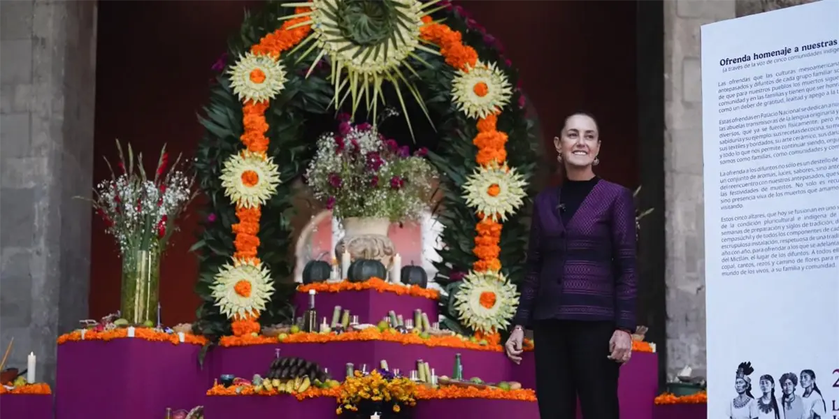 “La ofrenda en Palacio Nacional se llena de flores, colores, canto y fuego. Cada pétalo de cempasúchil marca el camino de regreso para aquellas mujeres que sembraron vida en su paso por la tierra”, escribió la mandataria en su cuenta de X.