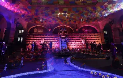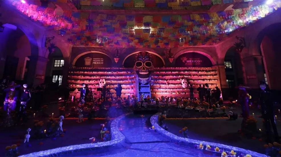TOLUCA, Estado de México.- El Palacio de Gobierno del Estado de México se ha transformado en un espacio de reverencia y cultura con la instalación de una ofrenda monumental compuesta por mil cráneos.