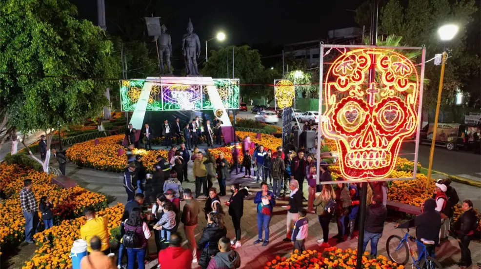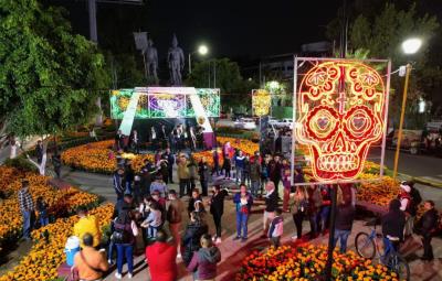 Instalan 7 ofrendas monumentales en diferentes puntos de Ecatepec para conmemor el Día de Muertos; se utilizaron 69 mil macetas de cempasúchil.