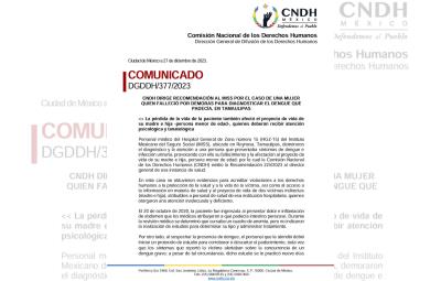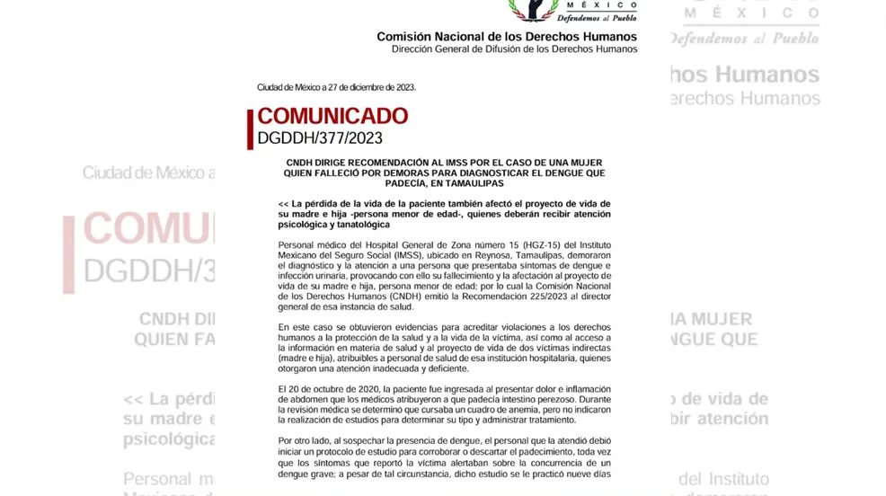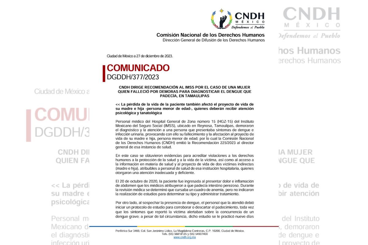 Personal médico del Hospital General de Zona número 15 (HGZ-15) del Instituto Mexicano del Seguro Social (IMSS), ubicado en Reynosa, Tamaulipas, demoraron el diagnóstico y la atención a una persona que presentaba síntomas de dengue e infección urinaria, provocando con ello su fallecimiento y la afectación al proyecto de vida de su madre e hija, persona menor de edad; por lo cual la Comisión Nacional de los Derechos Humanos (CNDH) emitió la Recomendación 225/2023 al director general de esa instancia de salud.
