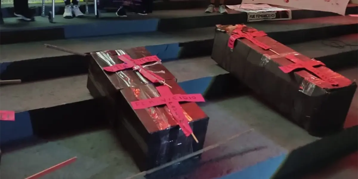 En esa parte de la protesta de manera simbólica además de manifestarse, realizaron la quema de un ataúd hecho con cartón, símbolo de la lucha y el dolor de las familias que son víctimas colaterales de la violencia.