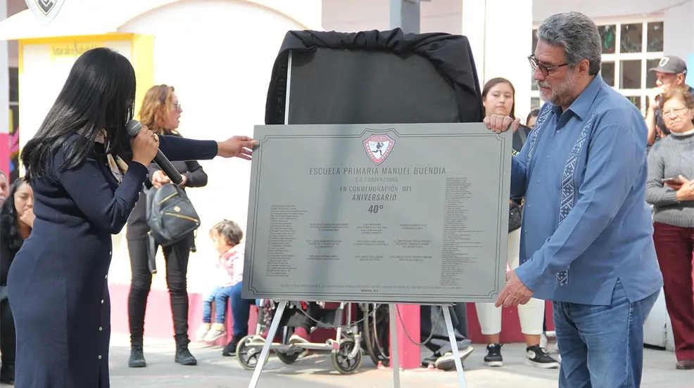 En reconocimiento a los 40 años de otorgar servicios educativos gratuitos a la población, el titular de la AEFCM y la directora del plantel develaron una placa conmemorativa. La escuela primaria Manuel Buendía, fundada el 16 de noviembre de 1984 en honor al reconocido periodista mexicano, cuenta con una matrícula de 304 alumnos y 19 profesores frente a grupo. Se trata de una escuela de jornada ampliada con horario de 8:00 a 14:30 horas.