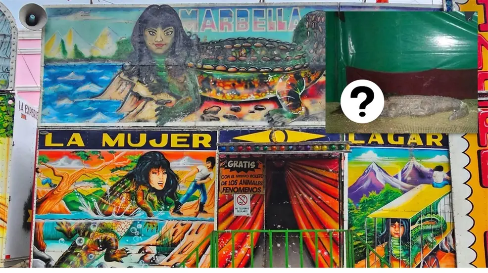 Al pasear por las calles llenas de festejos del recinto ferial te llegarás a encontrar el famoso tráiler de la mujer lagarto, donde los altos parlantes anuncian a los animales inusuales que tienen para mostrar. La historia de este enigmático ser se remonta al año de 1990, cuando Marbella, la mujer lagarto, llegó por primera vez a la feria más famosa del estado de Yucatán.