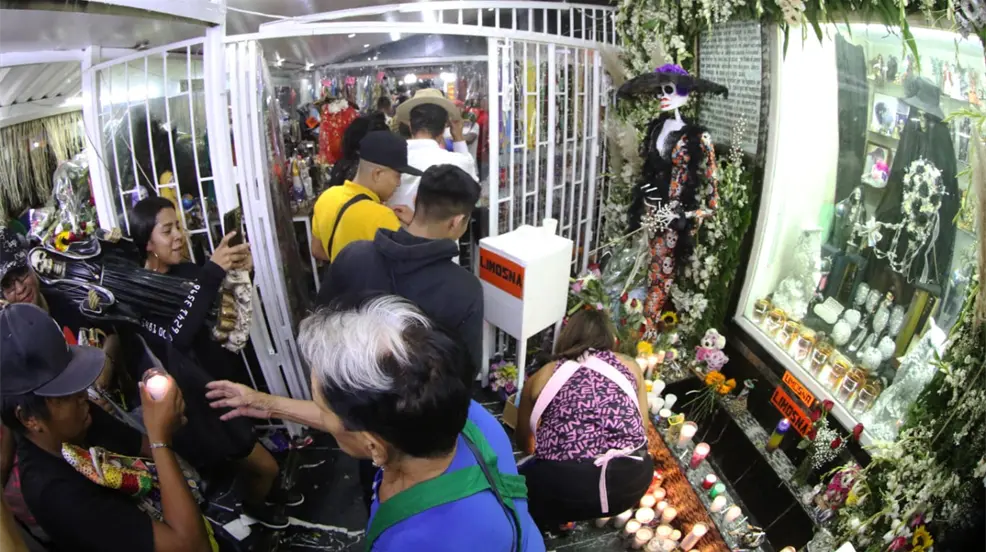 Las clases sociales parecen no existir aquí, y cualquier estereotipo está libre de prejuicio. De hecho, es la gente más humilde la que se congrega en este lugar, donde instalan pequeños altares en la banqueta o el asfalto que rodea el santuario (como sucedería en cualquier atrio de iglesia), conviviendo en una verbena con otros peregrinos, compartiendo todo tipo de comida, dulces, frutas, marihuana, bebidas embriagantes y confraternizando durante las 24 horas que dura esta especial fecha, que se combina con el Día de Muertos.