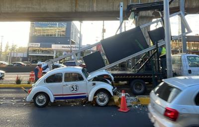Un auto réplica del personaje de ficción 'Herbie', se impactó contra una aguja de incorporación al segundo piso de Periférico y derribó señalamientos viales.