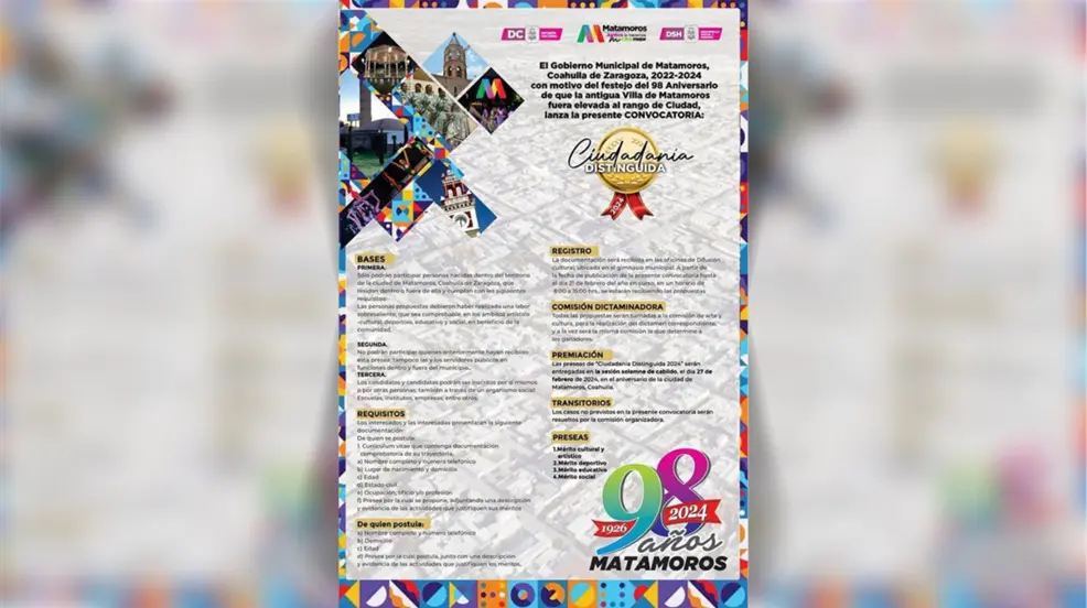 MATAMOROS, Coahuila. - El Gobierno Municipal de Matamoros reitera su invitación a participar en la convocatoria 'Ciudadano Distinguido 2024' en conmemoración del 98 aniversario de que la antigua Villa de Matamoros se convirtiera en ciudad.