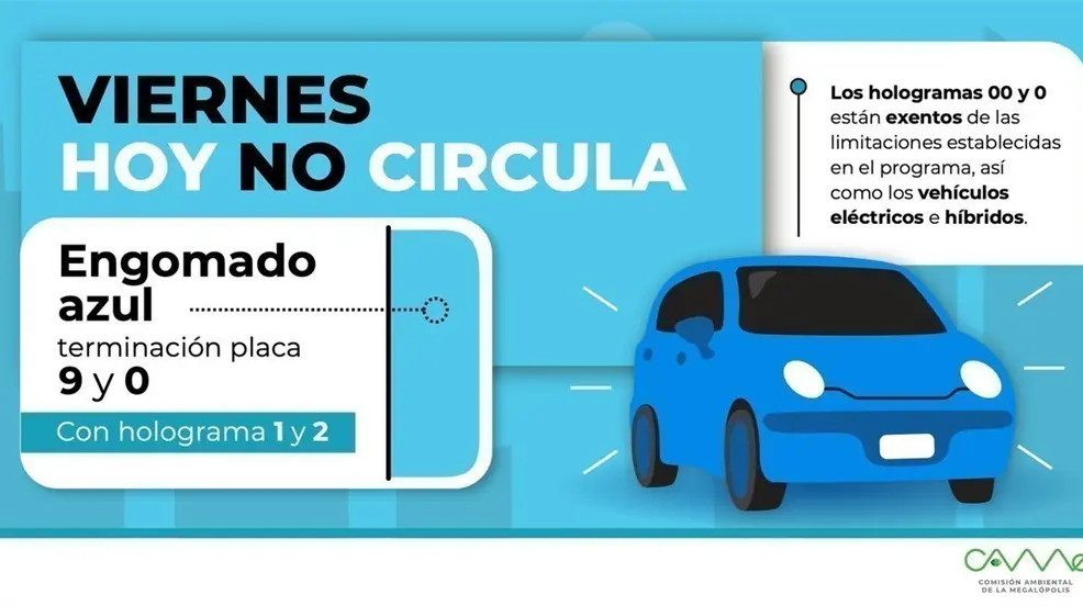 CIUDAD DE MÉXICO. - Este viernes, el programa de movilidad utilizado para todos los vehículos con terminación de placas 9 y 0, engomado azul, con holograma de verificación 1 y 2.. Recuerda que los hologramas 0 y 00 están exentos de esta medida .