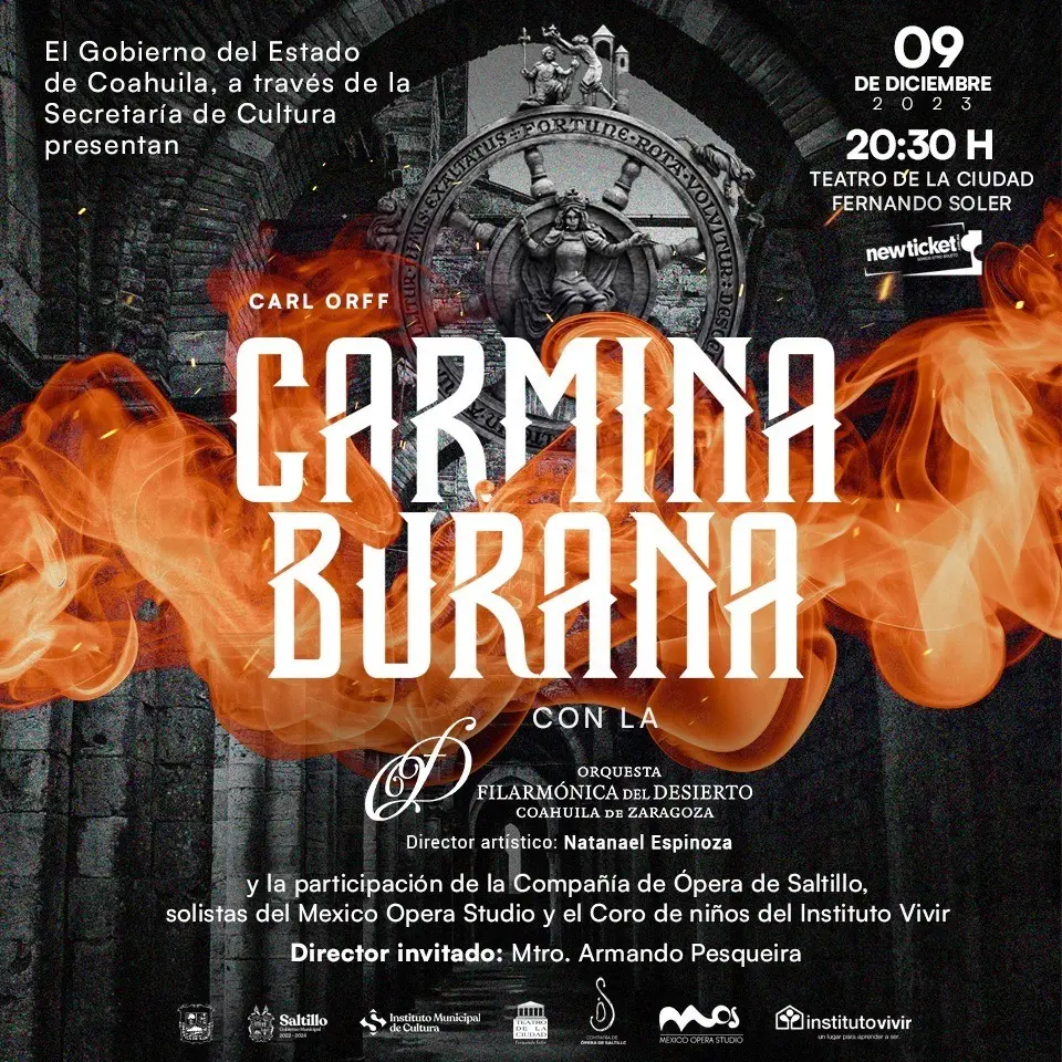 SALTILLO, Coahuila. El próximo sábado 09 de diciembre de 2023 a las 20:30 h, el Teatro de la Ciudad Fernando Soler se llenará de magia y talento con la presentación de Carmina Burana, por parte de la Orquesta Filarmónica del Desierto.