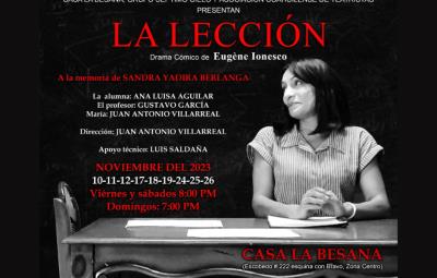 SALTILLO, Coahuila. Los fines de semana son de teatro en Saltillo, en esta ocasión compartimos La Lección, un drama cómico de Eugène Ionesco, en memoria de Sandra Yadira Berlanga y dirigida por el actor, director y escritor de teatro coahuilense, Juan Antonio Villarreal.