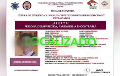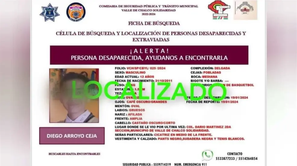VALLE DE CHALCO, Estado de México.- Tras más de 24 horas de búsqueda, fue localizado el adolescente desaparecido en Valle de Chalco, Diego Arrollo, de 12 años de edad. El menor fue visto por última vez al salir de la escuela secundaria José Antonio Álzate, donde cursa el primer grado. Sin embargo, no llegó a su casa como habitualmente lo hacía, lo que preocupó a sus padres y los llevó a reportar su desaparición a las autoridades municipales.