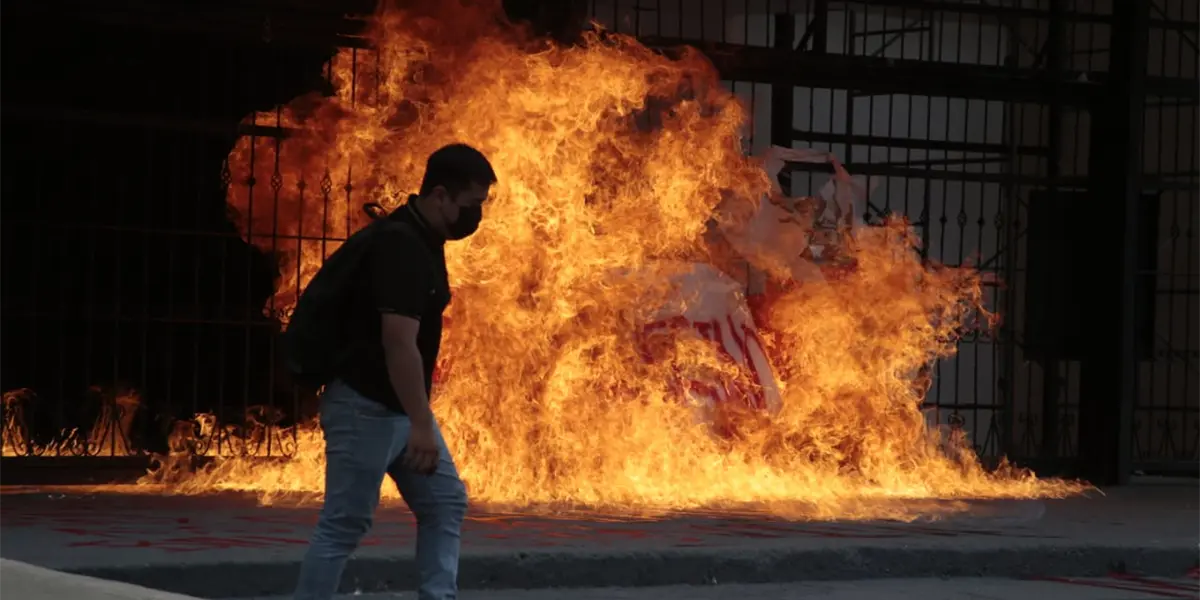 Estudiantes de la Normal Rural Mactumatzá y el colectivo “Madres en Resistencia” quemaron una manta colocada en las rejas de acceso y realizaron pintas en el Palacio de Gobierno.
