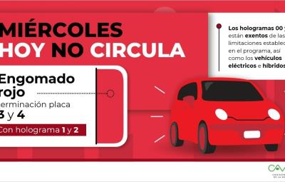 vehículos con engomado de color rojo, holograma 1 o 2, y cuyas placas terminen en los números 3 o 4.
