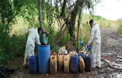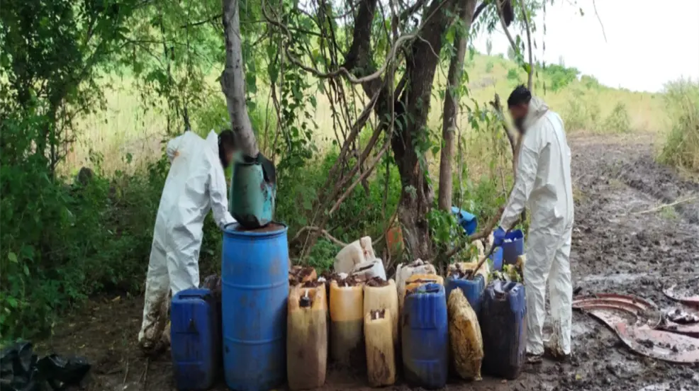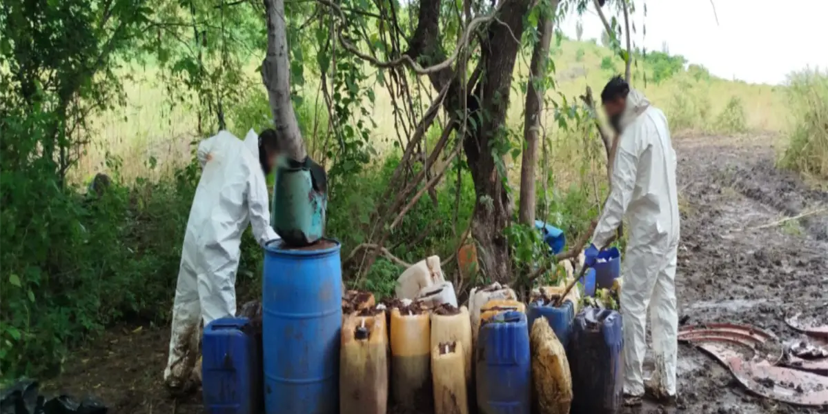 Por su parte, en Cosalá, Sinaloa, tras su localización, fue inhabilitada un área de concentración de material diverso para elaborar drogas sintéticas, además fueron asegurados 1400 litros de sustancias para la fabricación de metanfetamina, cuya afectación, según cálculos federales, equivale a $28 millones de pesos.