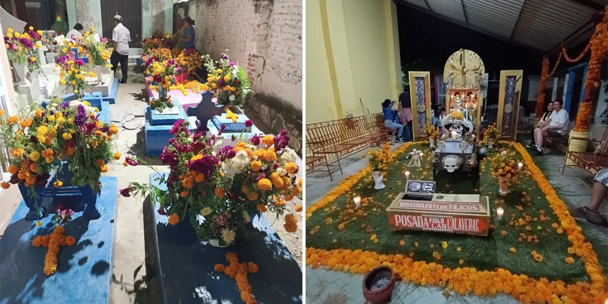Familias enteras visitan el recinto desde temprana hora y lo disponen como un lugar adornado con flores color granate conocidas como "terciopelo", y el tradicional cempasúchil que se mantiene cultivando en los alrededores de la localidad.