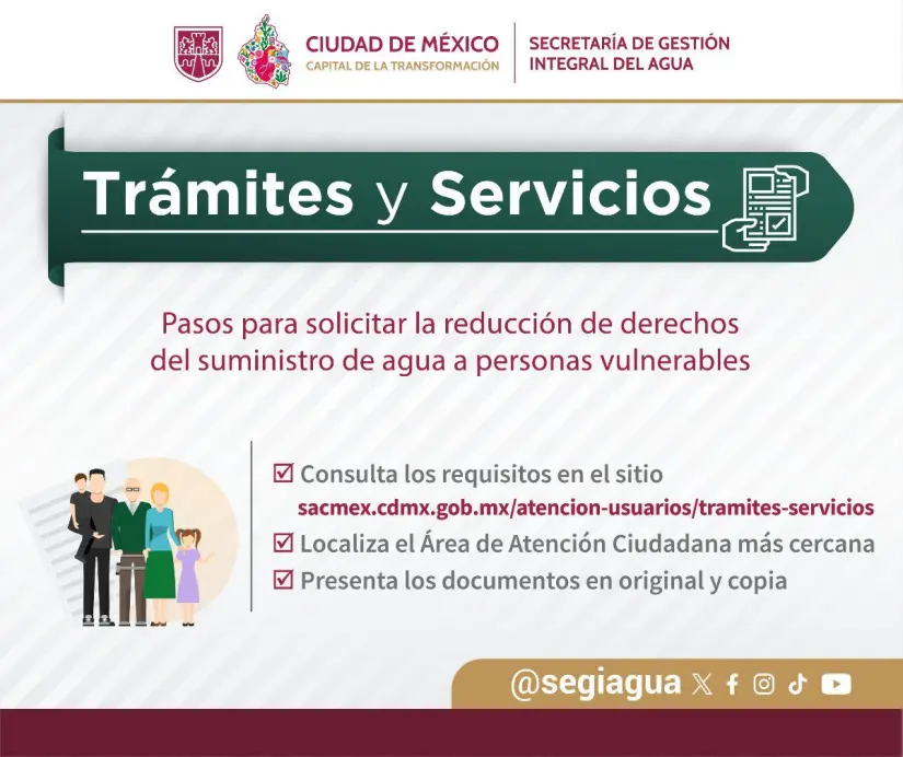 El beneficio del 50% en el suministro de agua está dirigido a propietarios de inmuebles que pertenezcan a grupos vulnerables. Entre ellos se incluyen: