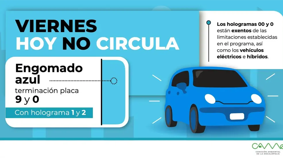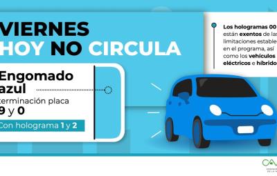 CIUDAD DE MÉXICO.- Este viernes 8 de diciembre, como parte del programa Hoy No Circula, se establece la restricción para la circulación de vehículos con engomado de color azul, holograma 1 o 2, y cuyas placas terminen en los números 9 y 0.