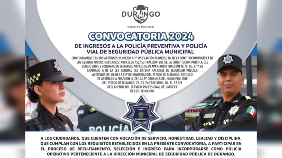 DURANGO, Durango.- La Dirección Municipal de Seguridad Pública de Durango, lanza su Convocatoria 2024 de ingresos a la Policía Preventiva y Policía Vial, la cual va dirigida a los ciudadanos que tengan entre 20 y 35 años de edad y cuenten con vocación de servicio, lealtad y disciplina.