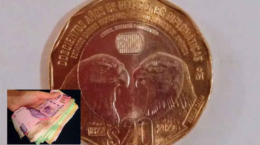 En 2023, el Banco de México (Banxico) celebró el bicentenario de las relaciones diplomáticas entre México y Estados Unidos, por lo cual, lanzó esta moneda conmemorativa de 20 pesos, catalogada de la familia C1. ¿Qué diseño tiene? En su anverso están impresas dos águilas: el Águila Real de México y el Águila Calva de Estados Unidos.