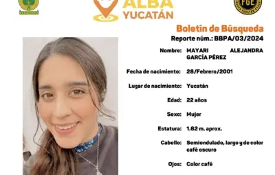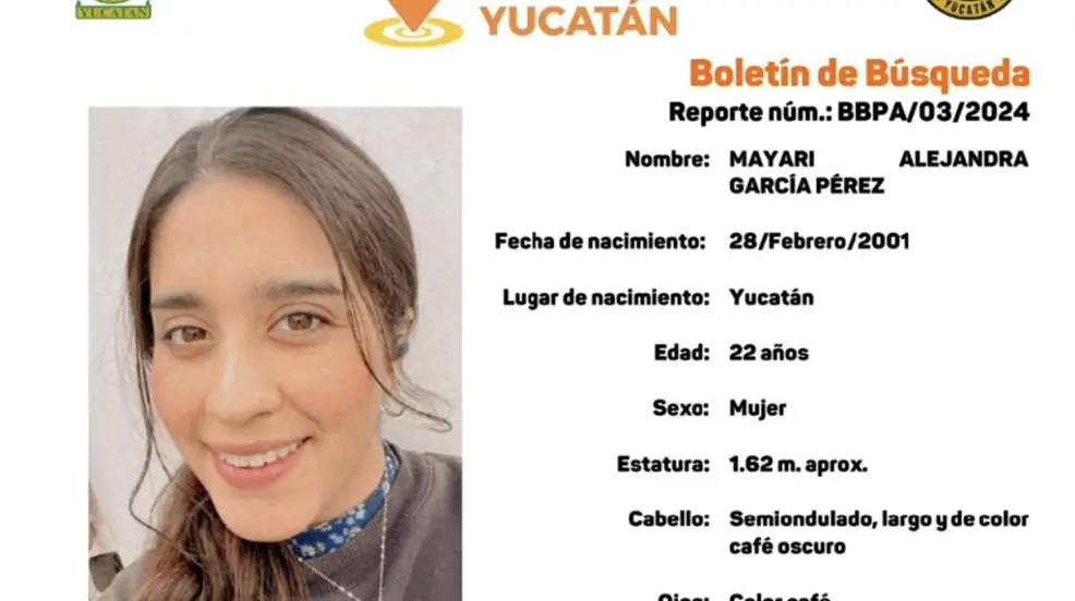 MÉRIDA, Yucatán.- La Fiscalía General del Estado de Yucatán (FGE) reportó la desaparición de Mayari Alejandra García Pérez, de 22 años de edad, quien fue vista por última vez el día 31 de enero en la colonia San Antonio Kaua III de Kanasín, pero el novio publicó una versión diferente de los hechos.