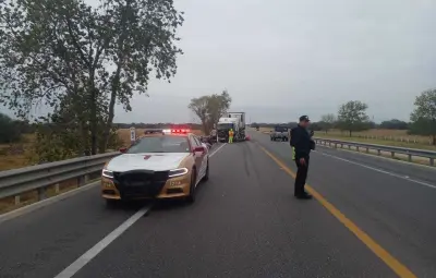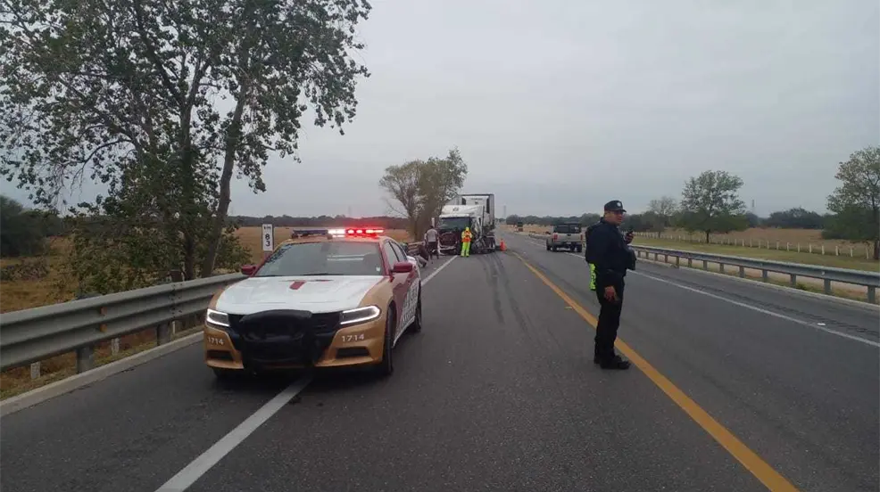 PADILLA, Tamaulipas.- Resultado de un choque de un tractocamión contra la valla de contención la circulación se encuentra cerrada en el sentido de sur a norte de la Carretera Federal 83.