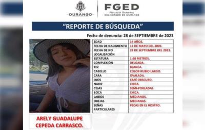 DURANGO, Durango.- A través de sus redes sociales, la Fiscalía General del Estado de Durango, emitió una ficha de búsqueda para localizar a Arely Guadalupe, una menor de 14 años quién ha sido reportada como desaparecida.