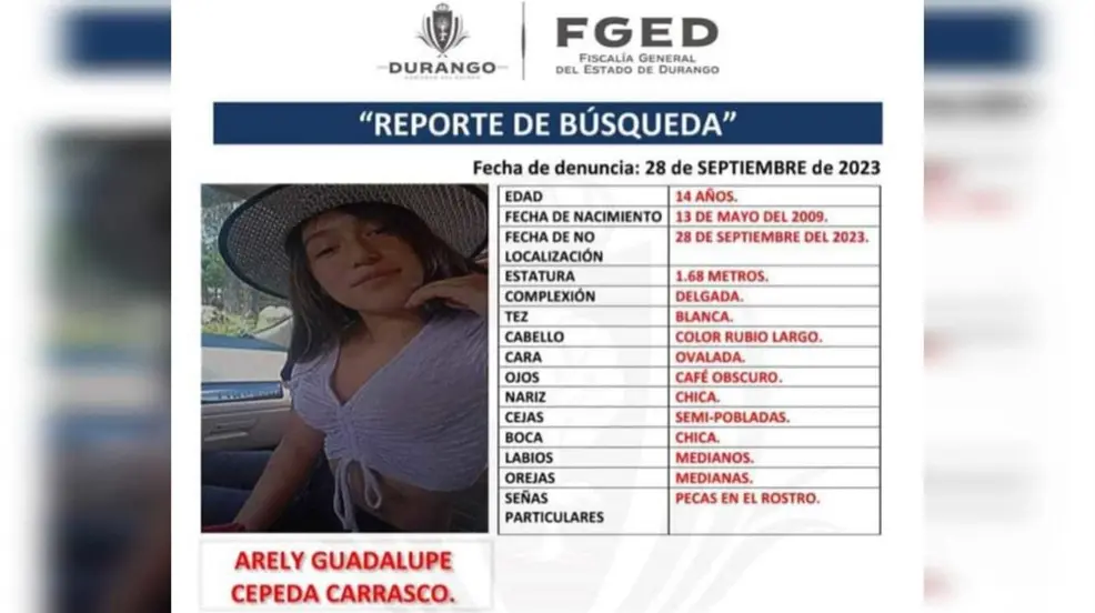 Según la ficha, Arely Guadalupe se encuentra desaparecida desde el día 27 de septiembre de 2023, siendo en el fraccionamiento Barcelona en el municipio de Durango el lugar donde se le pudo observar por última vez.