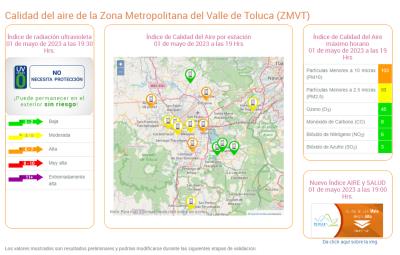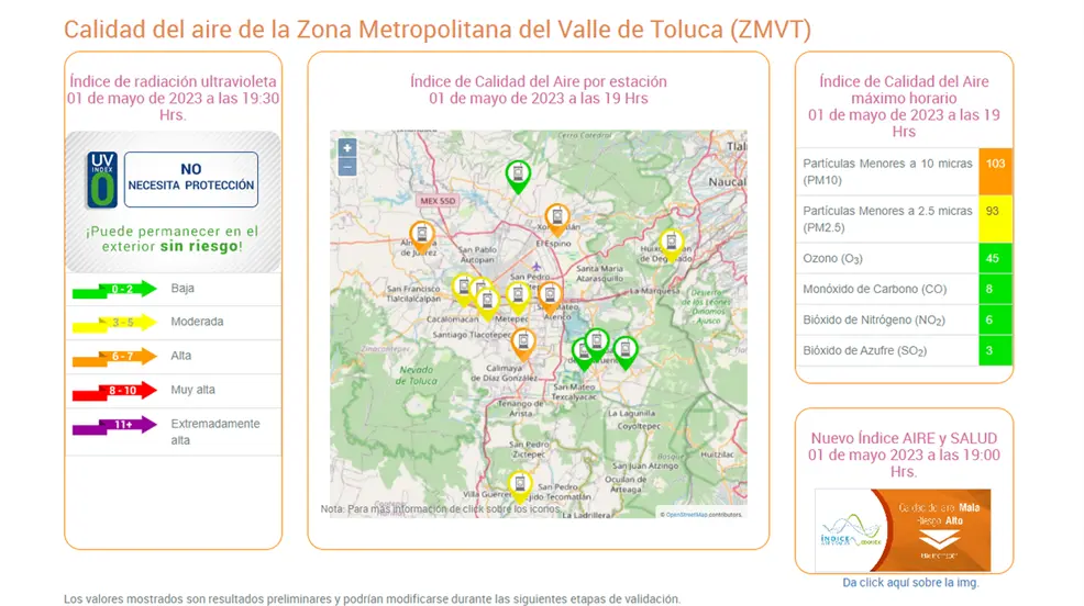 TOLUCA, Estado de México.- El reporte de calidad del aire en el Valle de Toluca de las 19:00 horas de este 1 de mayo informa que persiste la mala calidd del aire.