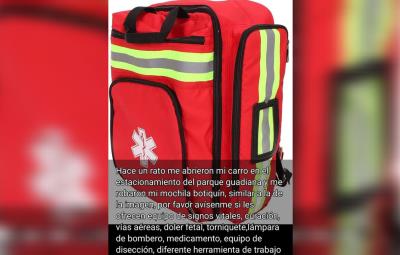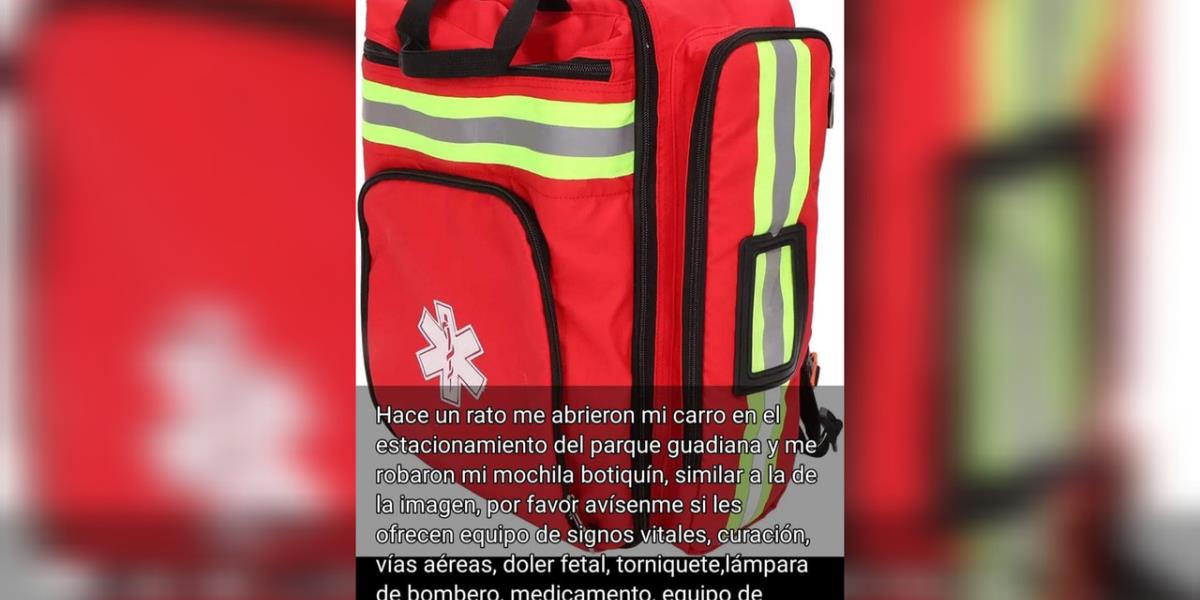 La mochila robada es de color rojo y cuenta con reflejantes, lo que la hace fácilmente identificable. En su interior, se encontraba material para chequeo de signos vitales, fundamental para el trabajo que realiza esta técnica en urgencias médicas.