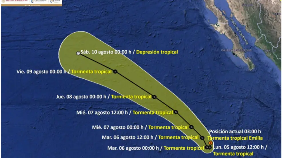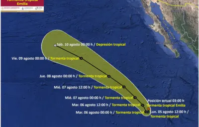 LA PAZ, Baja California Sur.- El Servicio Meteorológico Nacional, fuente oficial del Gobierno de México, emitió un aviso sobre la tormenta tropical Emilia, localizada al sur-suroeste de Baja California Sur. Actualmente, la tormenta no representa peligro para el territorio nacional.