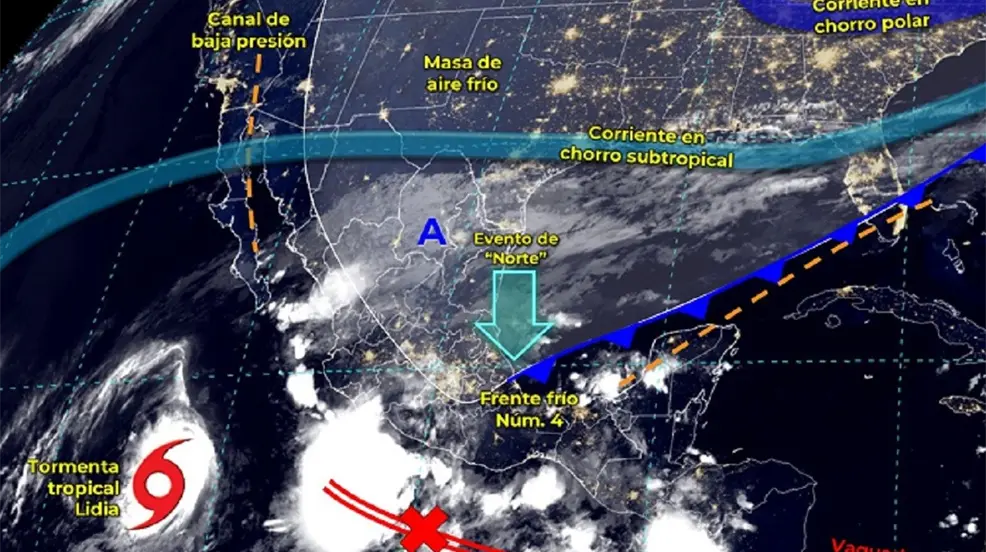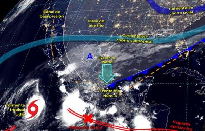 Las precipitaciones mencionadas serán originadas por el frente frío número 4, que se extenderá desde el oriente del Golfo de México hasta el sureste del país e interaccionará con la circulación del potencial ciclón tropical Dieciséis-E al sur de Guerrero, un canal de baja presión sobre el noroeste y occidente del país, la amplia circulación de Lidia y la entrada de humedad.