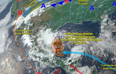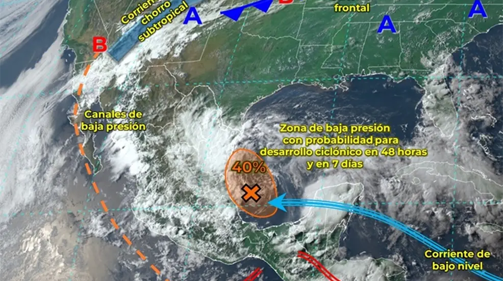 La zona de baja presión con probabilidad de desarrollo ciclónico o posible ciclón tropical que seguirá desplazándose hacia las costas de Tamaulipas y Veracruz, la vaguada monzónica la cual se extenderá sobre el sur y sureste del país, divergencia en altura, un canal de baja presión extendido sobre diferentes regiones y el flujo de humedad proveniente de ambos litorales, son los sistemas meteorológicos que propiciarán las condiciones atmosféricas descritas.