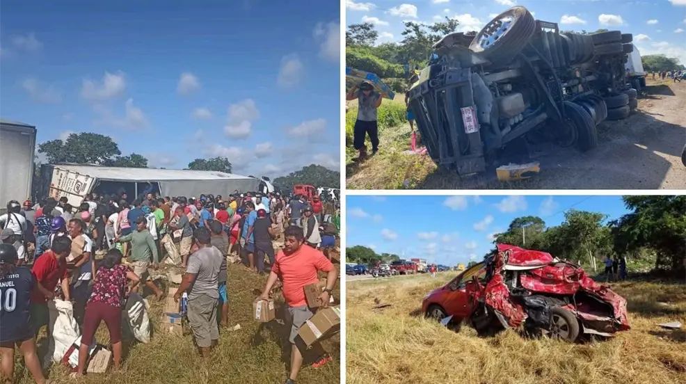 MÉRIDA, Yucatán.- Un aparatoso accidente en la carretera federal Mérida-Campeche, a la altura de Calkiní, dejó como saldo heridos y desató un acto de rapiña cuando un tráiler cargado de vinos volcó tras colisionar con un automóvil compacto.