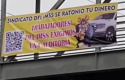 SALTILLO, Coahuila.- En un impactante acto de protesta, mantas aparecieron en varios puentes peatonales del periférico Luis Echeverría Álvarez (LEA), acusando al Sindicato del IMSS en Coahuila de desviar fondos destinados a los trabajadores. Los carteles, que exigen una auditoría al gremio, han generado gran conmoción entre los empleados del Instituto Mexicano del Seguro Social (IMSS).