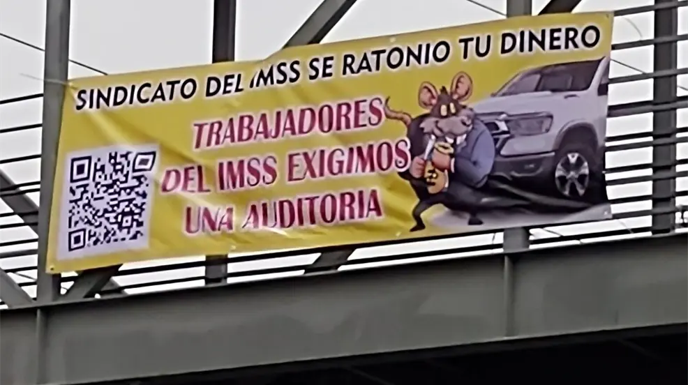 Mantas en puentes del periférico Luis Echeverría Álvarez acusan al Sindicato del IMSS en Coahuila de desviar fondos y exigen una auditoría. El líder sindical no ha respondido.