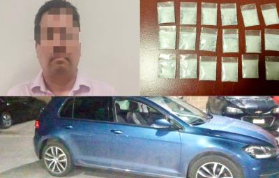 Según lo narrado por los elementos de seguridad, al percatarse de la presencia de la unidad de seguridad aceleró el motor y trató de huir, cuadras más adelante fue asegurado, al inspeccionarlo se le localizó en la guantera del automotor que conducía 18 bolsas de plástico tipo ziplok conteniendo polvo blanco semigranulado con las características del cristal y 200 pesos en efectivo.