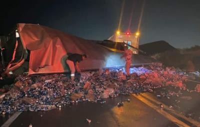 Un mar de latas inundó el pavimento de la carretera de Cuota Saltillo-Zacatecas con la volcadura de un camión que transportaba cerveza que volcó en el área.