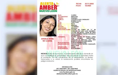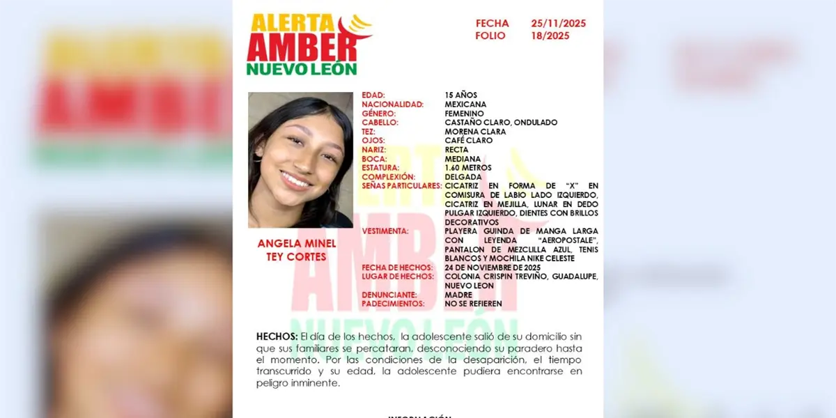 Las autoridades estatales activaron una Alerta Amber para localizar a Ángela Minel Tey Cortés, una joven de 15 años cuyo paradero se desconoce desde el lunes 24 de noviembre en el municipio de Guadalupe.