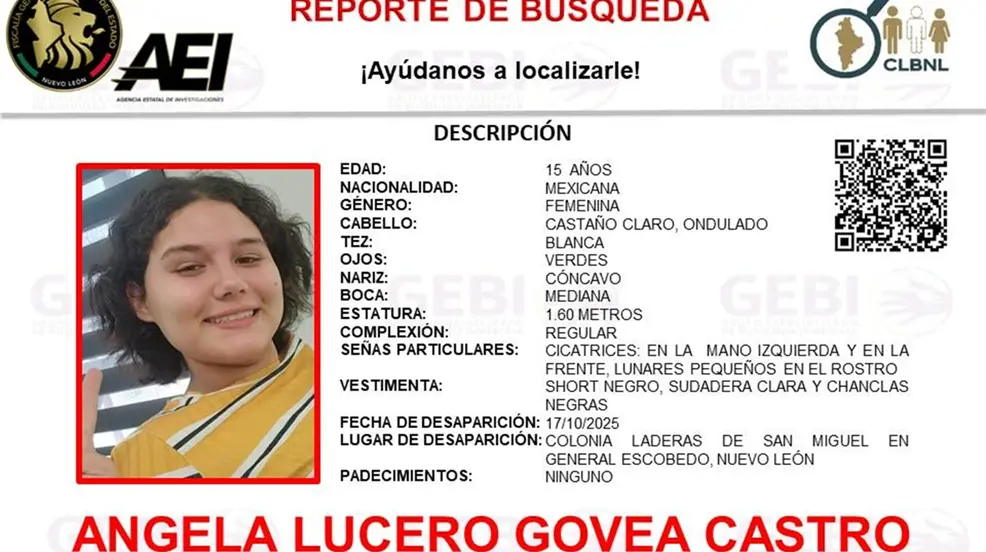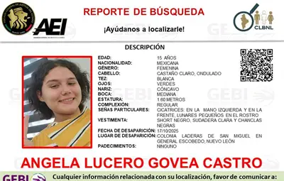 La Fiscalía General de Justicia de Nuevo León emitió un reporte de búsqueda para localizar a Ángela Lucero Govea Castro, de 15 años de edad, quien desapareció el pasado 17 de octubre de 2025 en la colonia Laderas de San Miguel, del municipio de Escobedo.